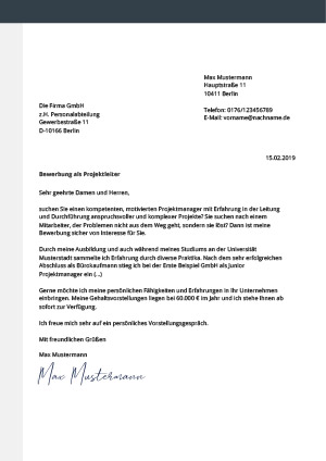 - In der Kopfzeile der Bewerbung ist Platz für deinen Namen und die Stellenbezeichnung.